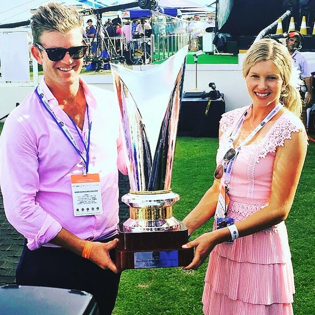 Julian Blaxland & partner Kacy Fogden with Sunlight's 2018 $2m Magic Millions Classic trophy
